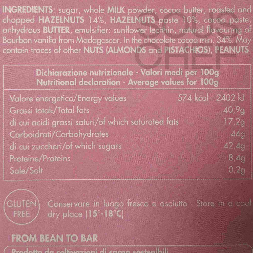 Product formulations and details may change. For the latest ingredients and allergen information always check product packaging prior to consumption. Ingredients: Sugar, whole milk powder, roasted and chopped hazelnuts 14%, cocoa butter, hazelnut paste 10%, cocoa paste, anhydrous butter, emulsifier: sunflower lecithin, natural flavouring of bourbon vanilla from madagascar. in the chocolate cocoa minimum 34%.