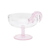 The coupe is made from hand-blown borosilicate glass. It has a transparent bowl and pale pink stem. A delicate pink prawn is perched on the rim.
