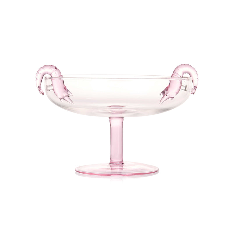 This prawn cocktail platter is perfect for retro appetisers. It features a clear glass bowl and a pale pink stem. Delicate glass prawns are perched on either side of the platter.