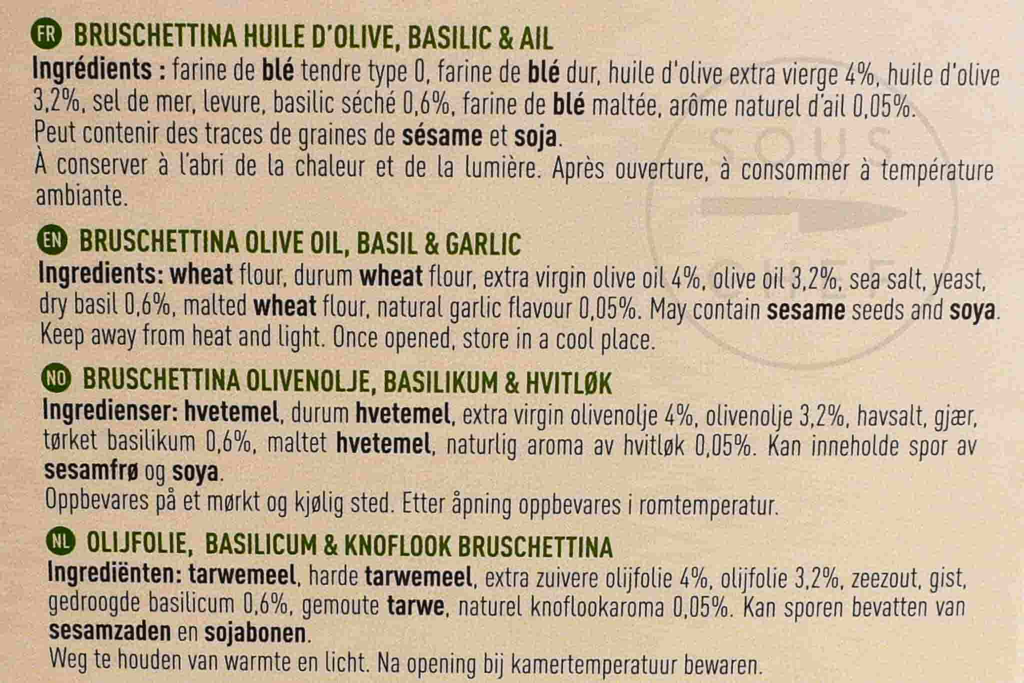 Product formulations and details may change. For the latest ingredients and allergen information always check product packaging prior to consumption. Ingredients: Soft wheat flour type 0, wheat flour , extra virgin olive oil 4%. olive oil 3.2%, sea salt, yeast, dried basil 0.6%, malted wheat flour, natural garlic flavour 0.05%.