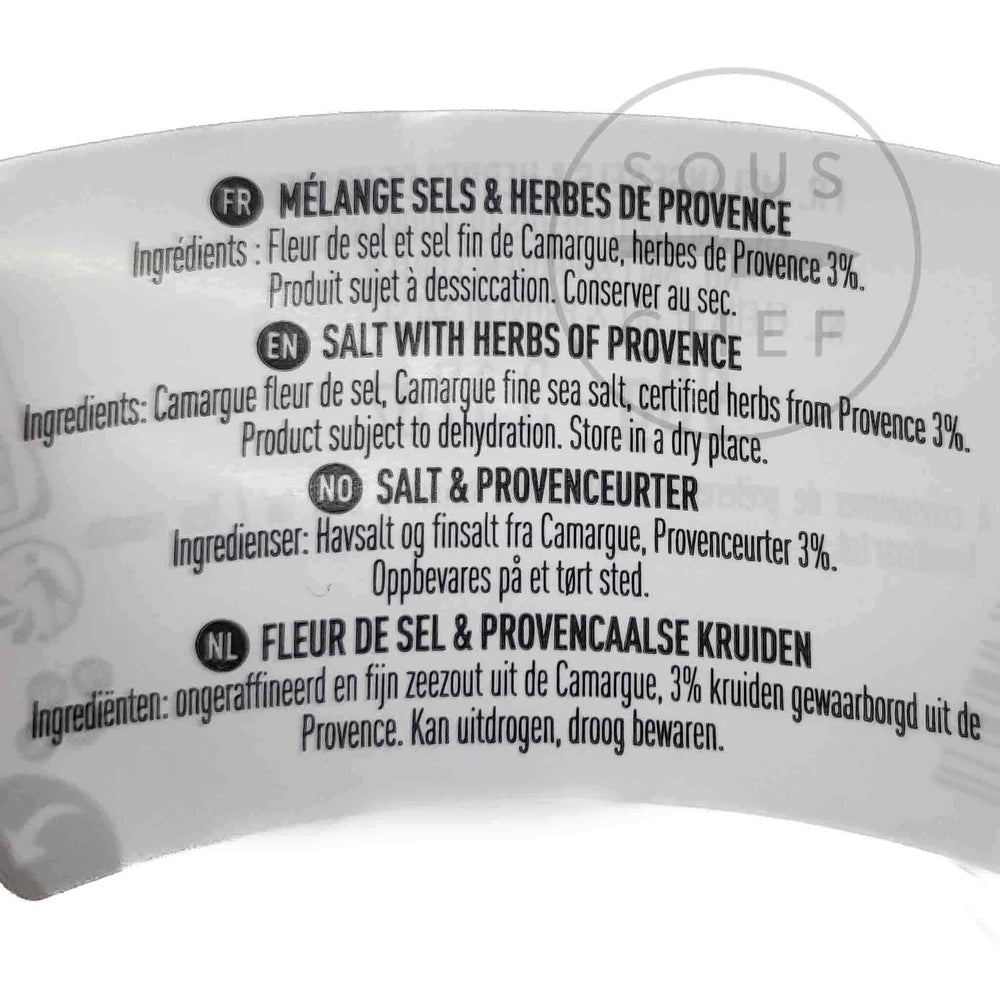 Product formulations and details may change. For the latest ingredients and allergen information always check product packaging prior to consumption. Ingredients: Salt (camargue fleur de fleur, Camargue fine sea salt) (France) 97%, herbs of Provence (France) 3% (rosemary 26%, oregano 26%, savory 26%, thyme 22%)