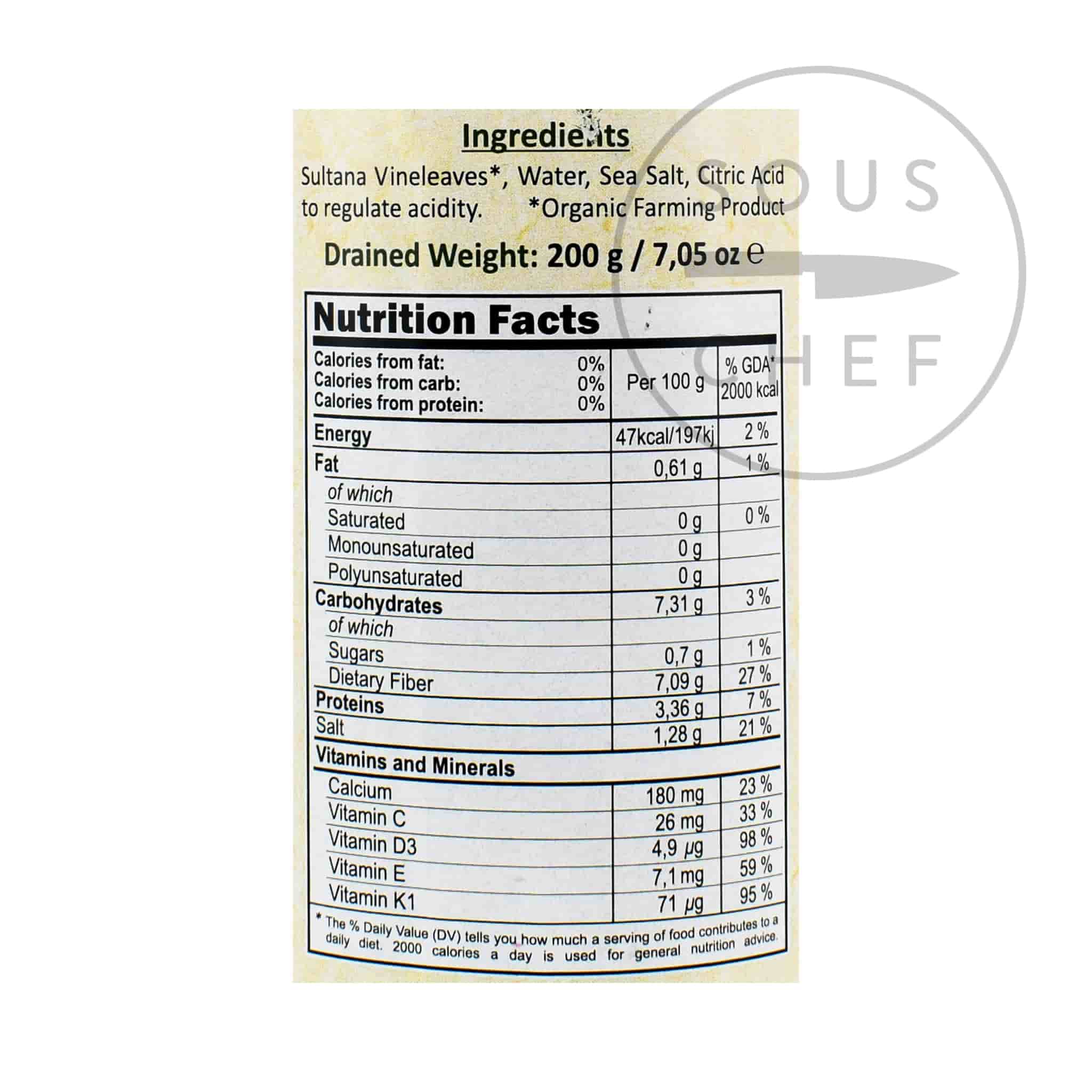 Product formulations and details may change. For the latest ingredients and allergen information always check product packaging prior to consumption. Ingredients: Vine Leaves (60 Pieces), water, salt, citric acid