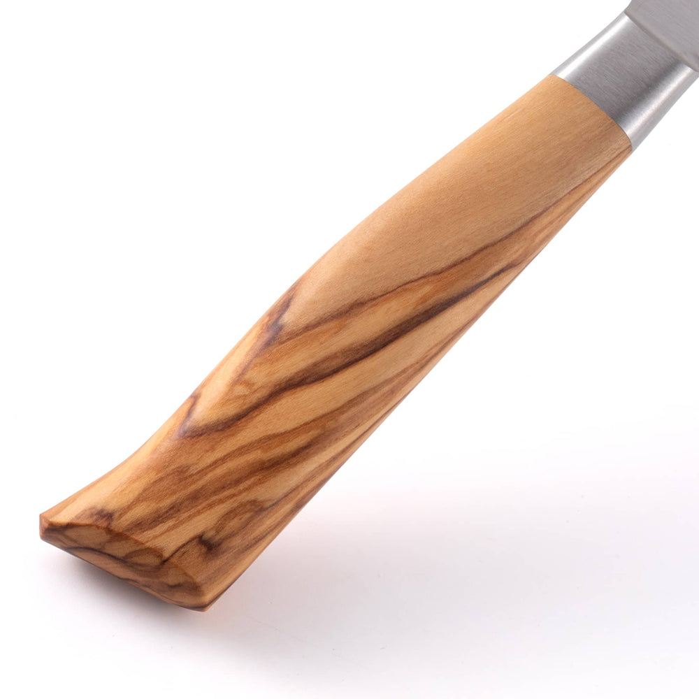 - The olive wood handle is beautiful and extremely durable. Olive wood is naturally water repellent and stain resistant.