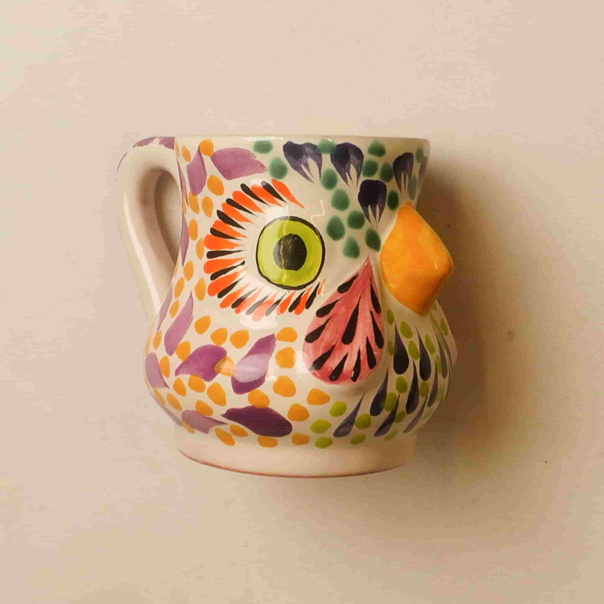 Brighten your day with this eye-catching rooster mug. Made in Mexico, it’s decorated in lively shades of orange, green and purple.