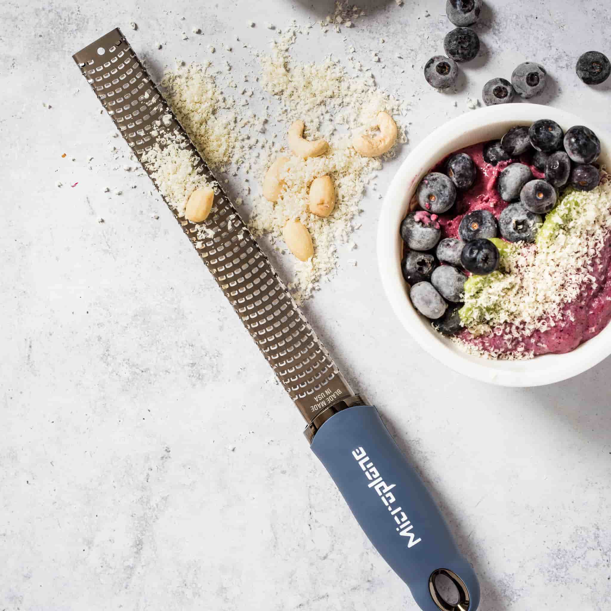 The Microplane denim blue premium zester is a must-have kitchen tool. It makes zesting and grating feel effortless. Use it to grate garlic and nutmeg or zest lemons and limes.