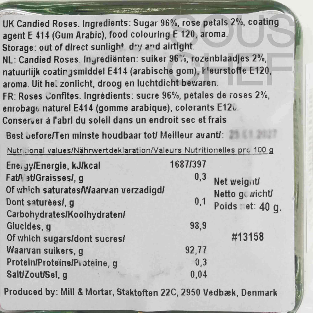 Product formulations and details may change. For the latest ingredients and allergen information always check product packaging prior to consumption. Ingredients: Sugar, rose petals (2%), stabilizer e412 (guar gum), colorants e120, e132, flavor