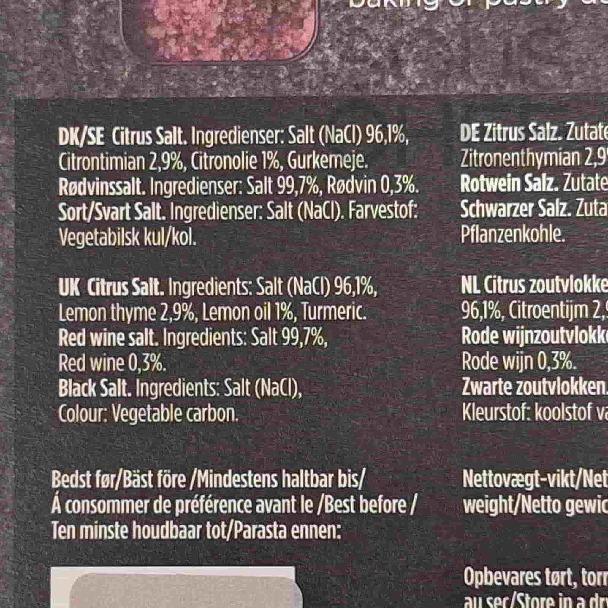 Product formulations and details may change. For the latest ingredients and allergen information always check product packaging prior to consumption. Ingredients: Red wine salt flakes: salt, red wine; black salt flakes; citrus salt flakes: salt (96.1%), lemon thyme (2.9%), lemon oil (1%), turmeric.