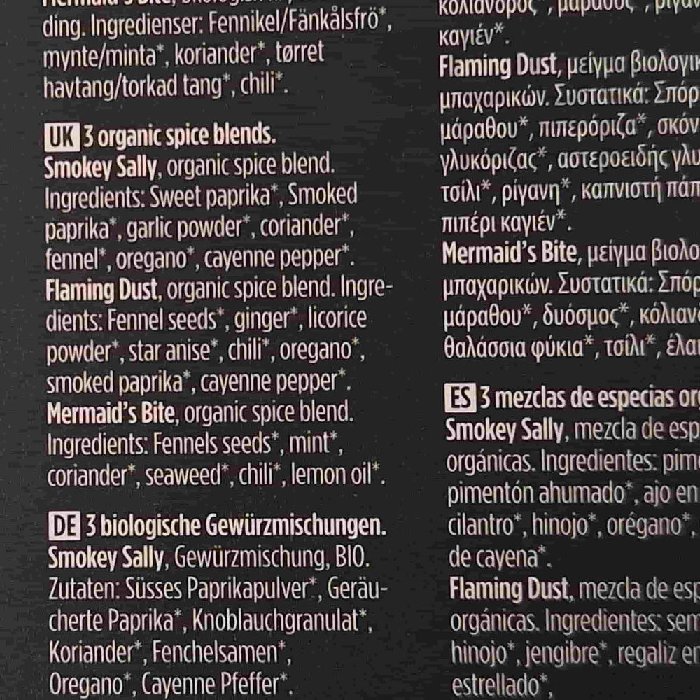 Product formulations and details may change. For the latest ingredients and allergen information always check product packaging prior to consumption. Ingredients: Flaming dust: fennel *, ginger *, liquorice powder *, star anise *, chili *, oregano *, chili flakes*, smoked paprika *, cayenne pepper *; mermaid's bite: fennel *, mint *, coriander *, dried seaweed, chili *, lemon oil*; smokey sally: sweet paprika *, smoked paprika *, garlic powder *, coriander *, fennel *, oregano *, cayenne pepper *.
