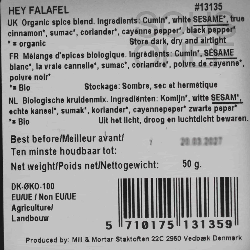 The spice blend combines earthy cumin with cinnamon, sumac and coriander. White sesame seeds add crunch and rich umami. All of the ingredients are organic and the blend doesn’t contain any salt. You can season your falafel mix to your liking.