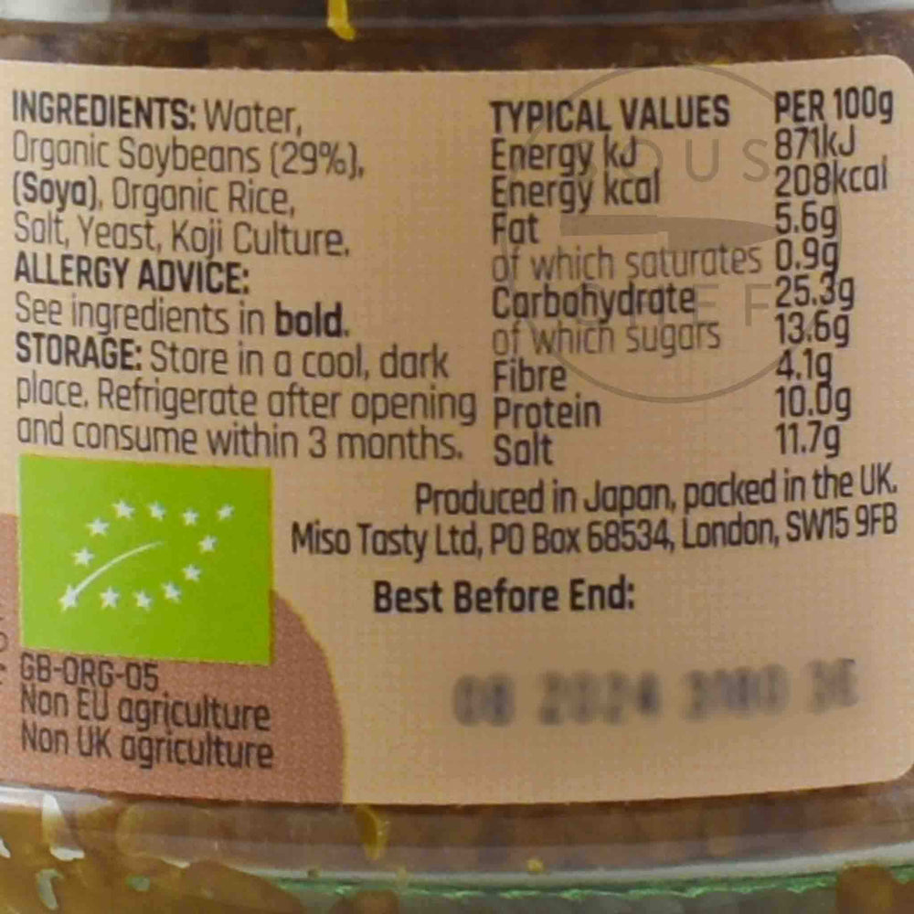 Product formulations and details may change. For the latest ingredients and allergen information always check product packaging prior to consumption. Ingredients: Water, organic soybeans (29%), organic rice, salt, yeast, koji.