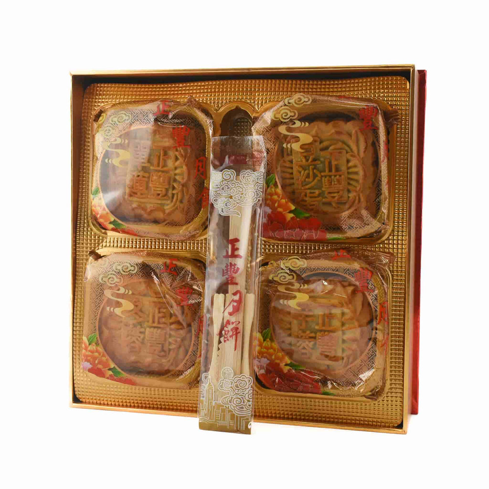 These mooncakes have four delicious fillings: white lotus paste, red bean paste, taro paste and winter melon paste. They are presented in a beautiful gold tin with a floral design - ideal for gifting. Serve the mooncakes at room temperature with Chinese tea.