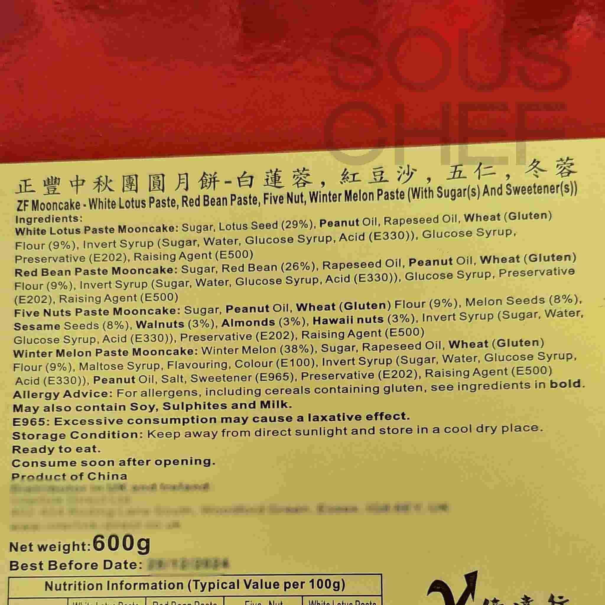 Product formulations and details may change. For the latest ingredients and allergen information always check product packaging prior to consumption. Ingredients: White lotus paste mooncake: sugar, lotus seed (29%), peanut oil, rapeseed oil, wheat (gluten) flour (9%), invert syrup (sugar, water, glucose syrup, acid (e330)), glucose syrup, preservative (e202), raising agent (e500). Red bean paste mooncake: sugar, red bean (26%), rapeseed oil, peanut oil, wheat (gluten) flour (9%), invert syrup (sugar, water, glucose syrup, acid (e330)), glucose syrup, preservative (e202), raising agent (e500). Five nuts paste mooncake: sugar, peanut oil, wheat (gluten) flour (9%), melon seeds (8%), sesame seeds (8%), walnuts (3%), almonds (3%), hawaii nuts (3%), invert syrup (sugar, water, glucose syrup, acid (e330)), preservative (e202), raising agent (e500). Winter melon paste mooncake: winter melon (38%), sugar, rapeseed oil, wheat (gluten) flour (9%), maltose syrup, flavouring, colour (e100), invert syrup (sugar, water, glucose syrup, acid (e330)), peanut oil, salt, sweetener (e965), preservative (e202), raising agent (e500).