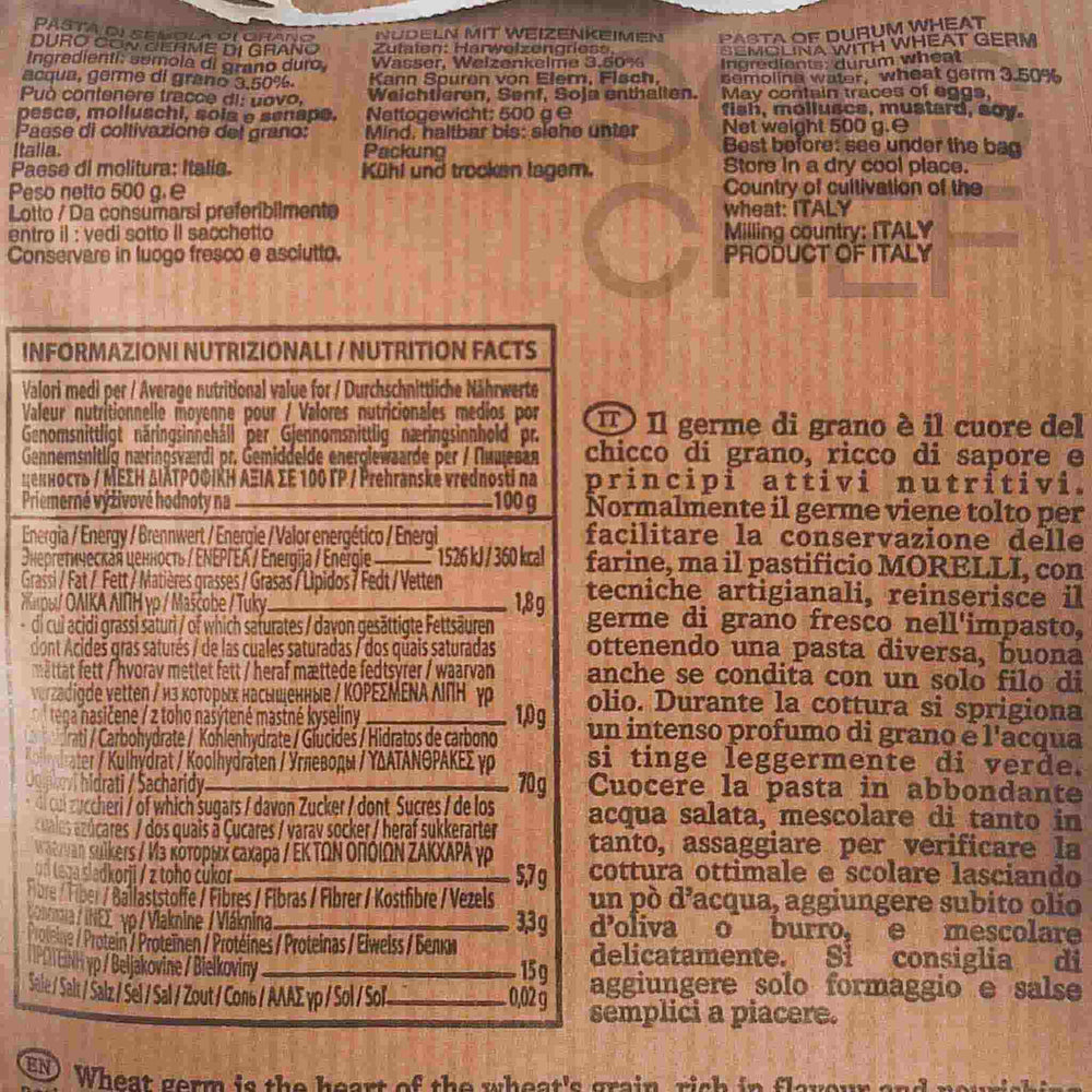 Morelli uses an artisan method of reincorporating wheat germ into semolina. It gives their pasta a unique flavour and aroma, similar to toasted wheat.