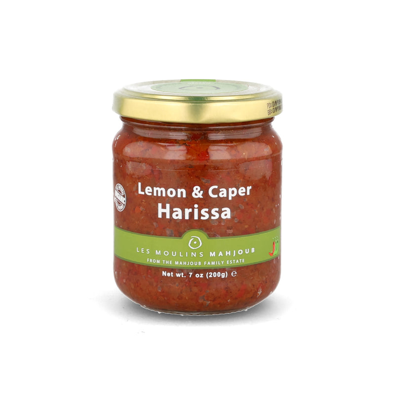 Moulins Mahjoub harissa is made in small batches without additives or preservatives. It’s milder than traditional harissa but with the same bold taste. Capers give it a briny tang, while lemon adds intense, zesty notes with a hint of bitterness.