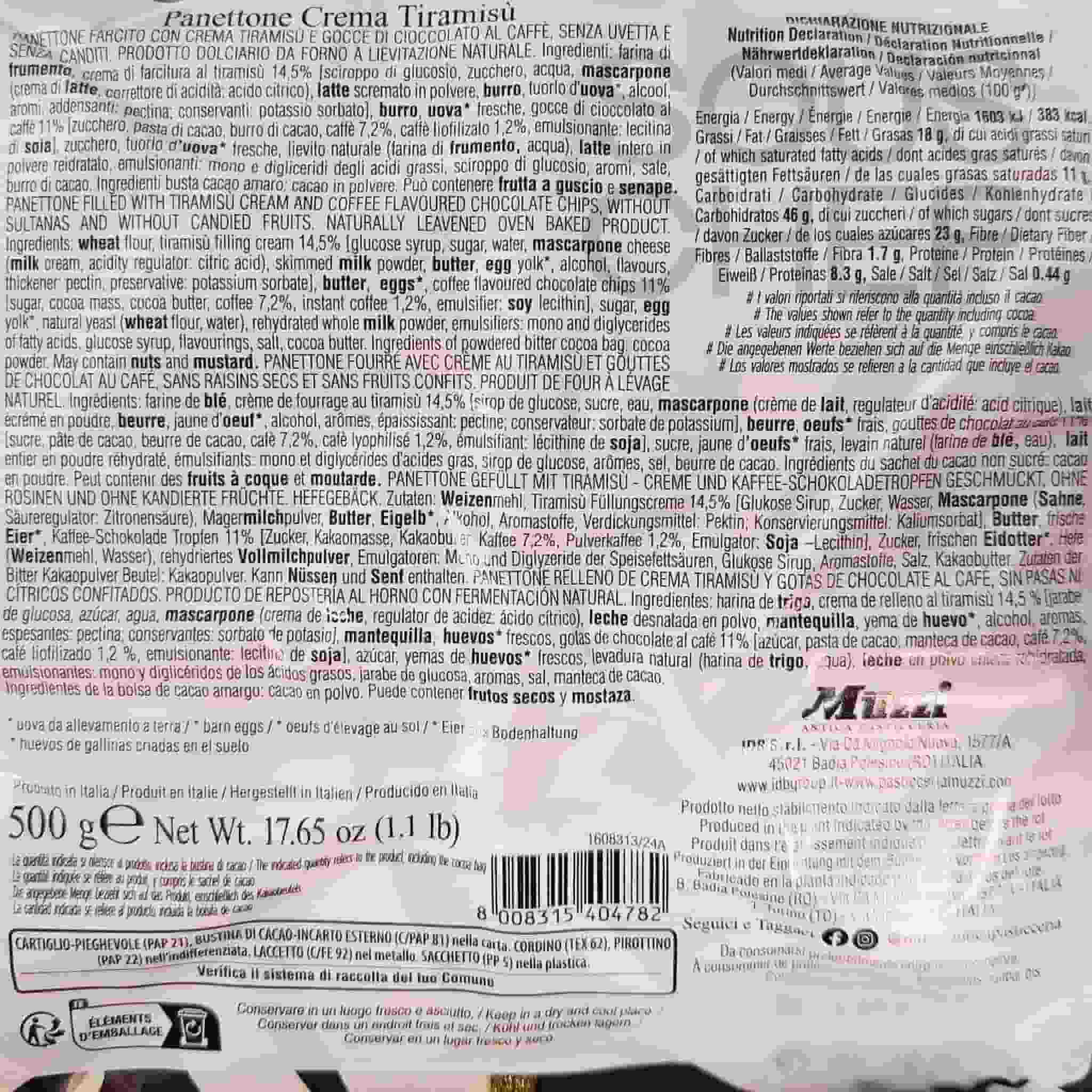 Product formulations and details may change. For the latest ingredients and allergen information always check product packaging prior to consumption. Ingredients: Wheat flour, tiramisù filling cream 14,5% [glucose syrup, sugar, water, mascarpone cheese (milk cream, acidity regulator: citric acid), skimmed milk powder, butter, egg yolk*,alcohol, flavours, thickener: pectin; preservative: potassium sorbate], butter, eggs*, coffee flavoured chocolate chips 11% [sugar, cocoa mass, cocoa butter, coffee 7,2%, instant coffee 1,2%, emulsifier: soy lecithin], sugar, egg yolk*, rehydrated whole milk powder, natural yeast (wheat flour, water), emulsifiers: mono and diglycerides of fatty acids, glucose syrup, flavourings, salt, cocoa butter. Ingredients of powdered bitter cocoa bag: cocoa powder.