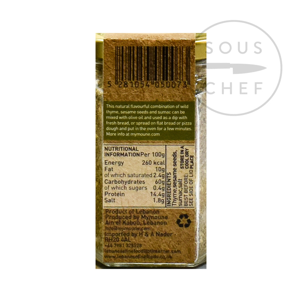 Mymouné zaatar is made to a recipe typical to the mountainous region of Lebanon where the company is based. Try zaatar the traditional way by mixing with olive oil to form a runny paste - then brush onto flatbread, heat and roll it up to eat. Flatbreads of this type are called manoushi, and are a popular snack and breakfast food in Lebanon and Syria. Also try using zaatar in marinades and dry rubs for lamb, chicken and fish.