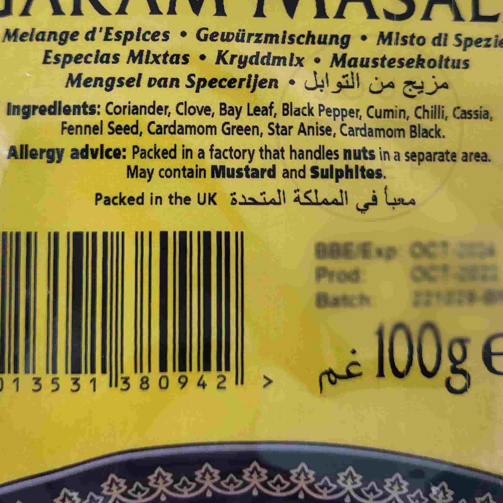Product formulations and details may change. For the latest ingredients and allergen information always check product packaging prior to consumption. Ingredients: 80g: Coriander, cloves, black pepper, cumin, chilli, stoneflower, cassia, fennel, bay leaves, black cardamon, clove leaves, triphala, star anise. 100g: Coriander, clove, bay leave, black pepper, cumin, chilli, cassia, fennel seed, cardamon green, star anise, cardamom black.