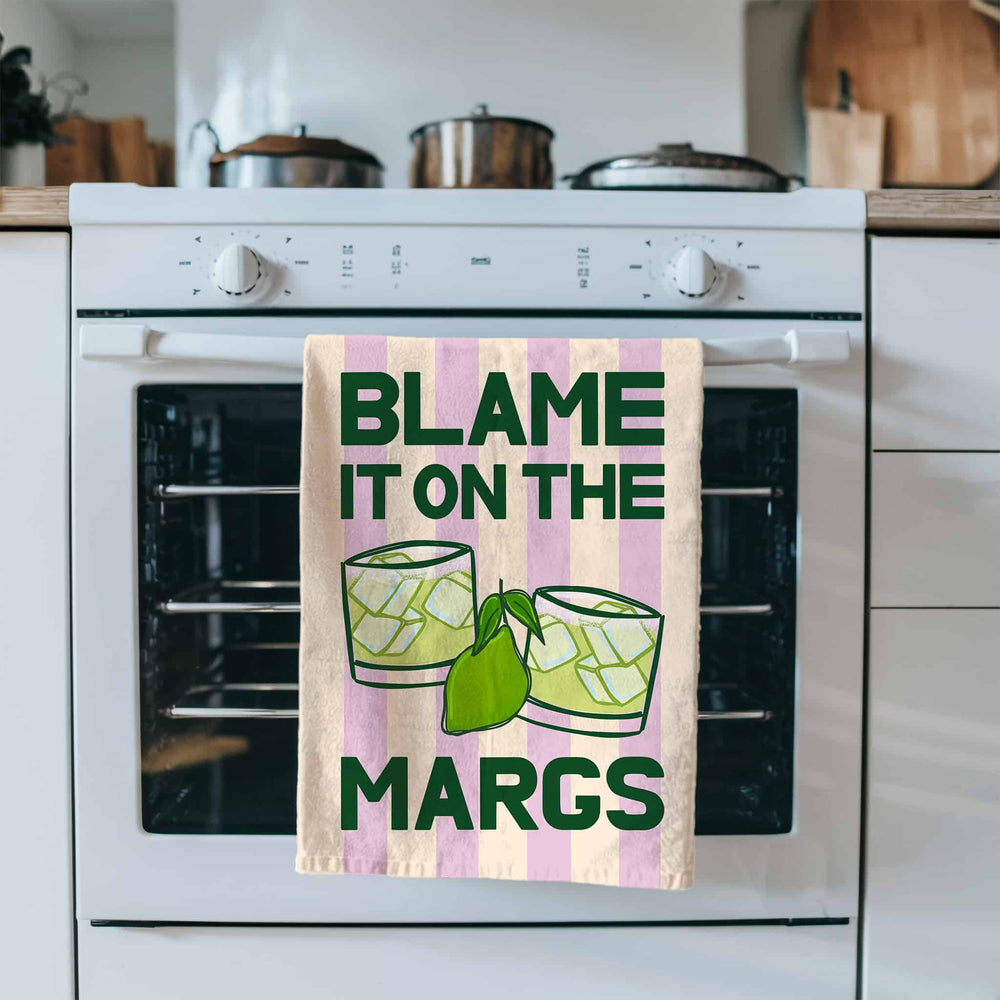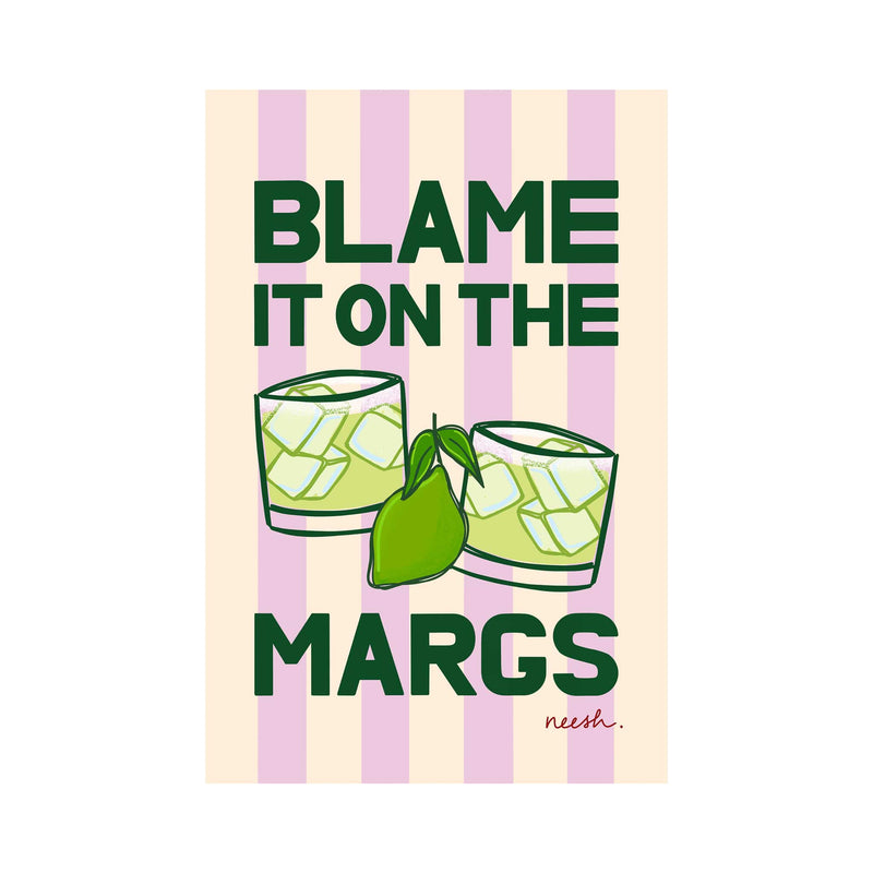 Green text declares ‘blame it on the margs’ - a statement any tequila drinker can relate to!