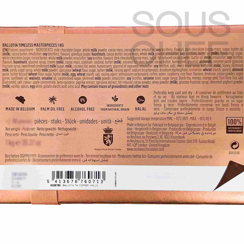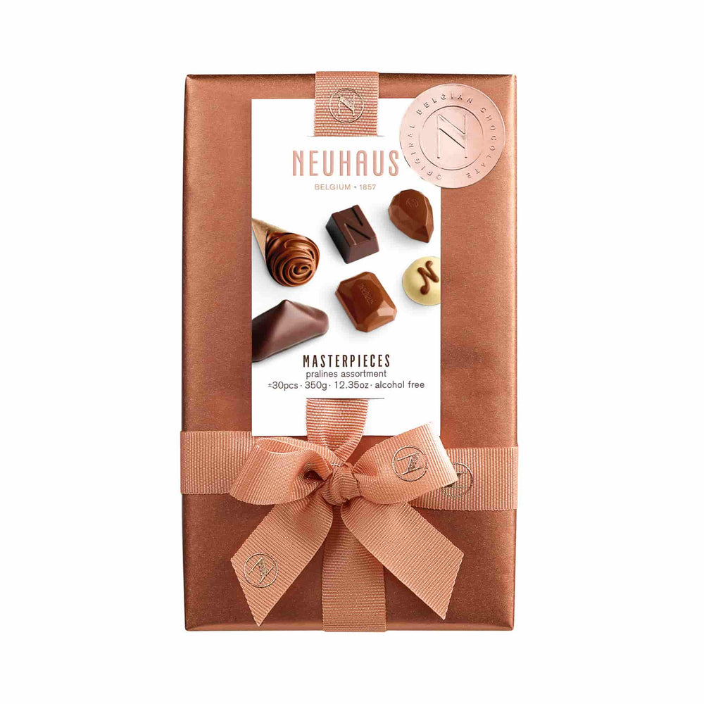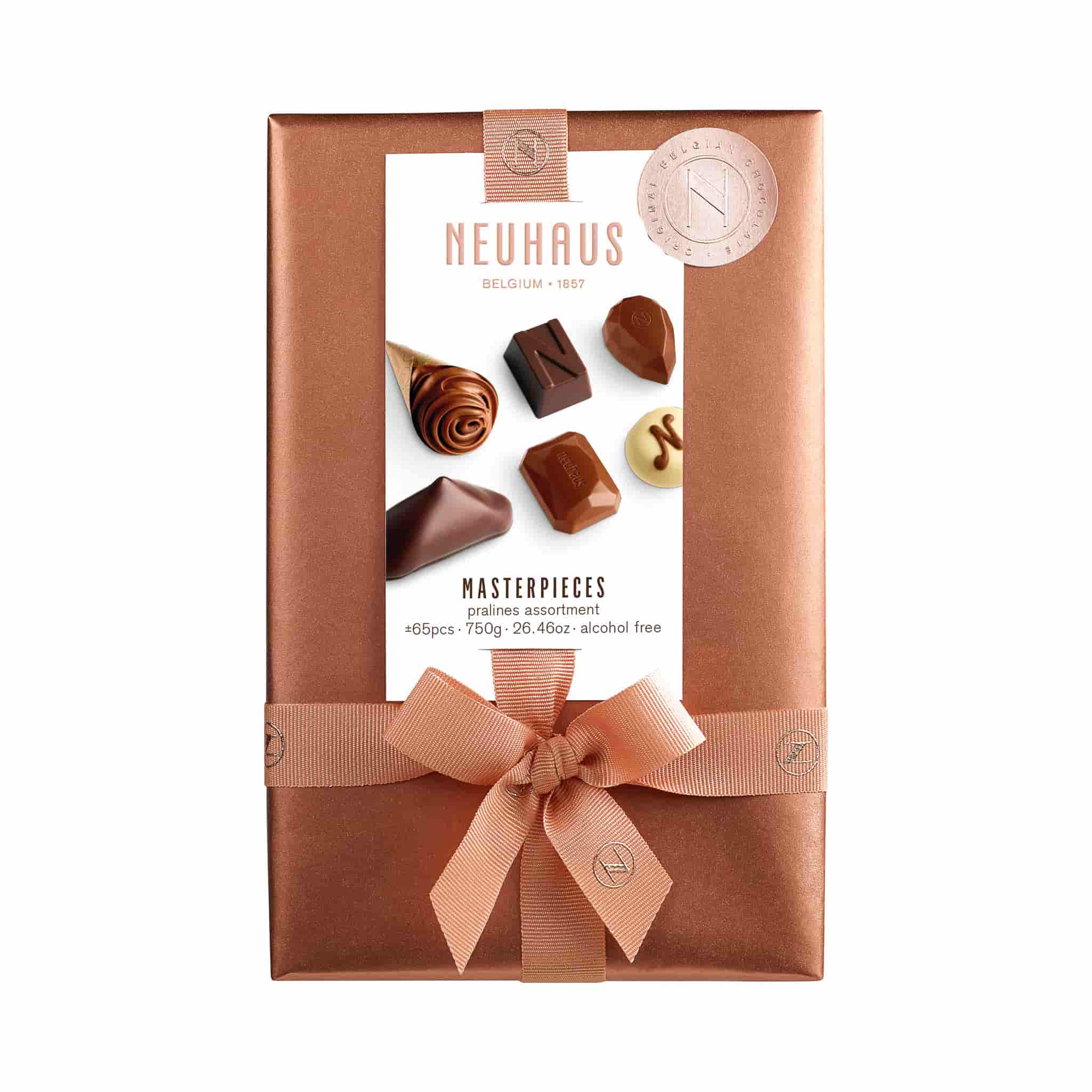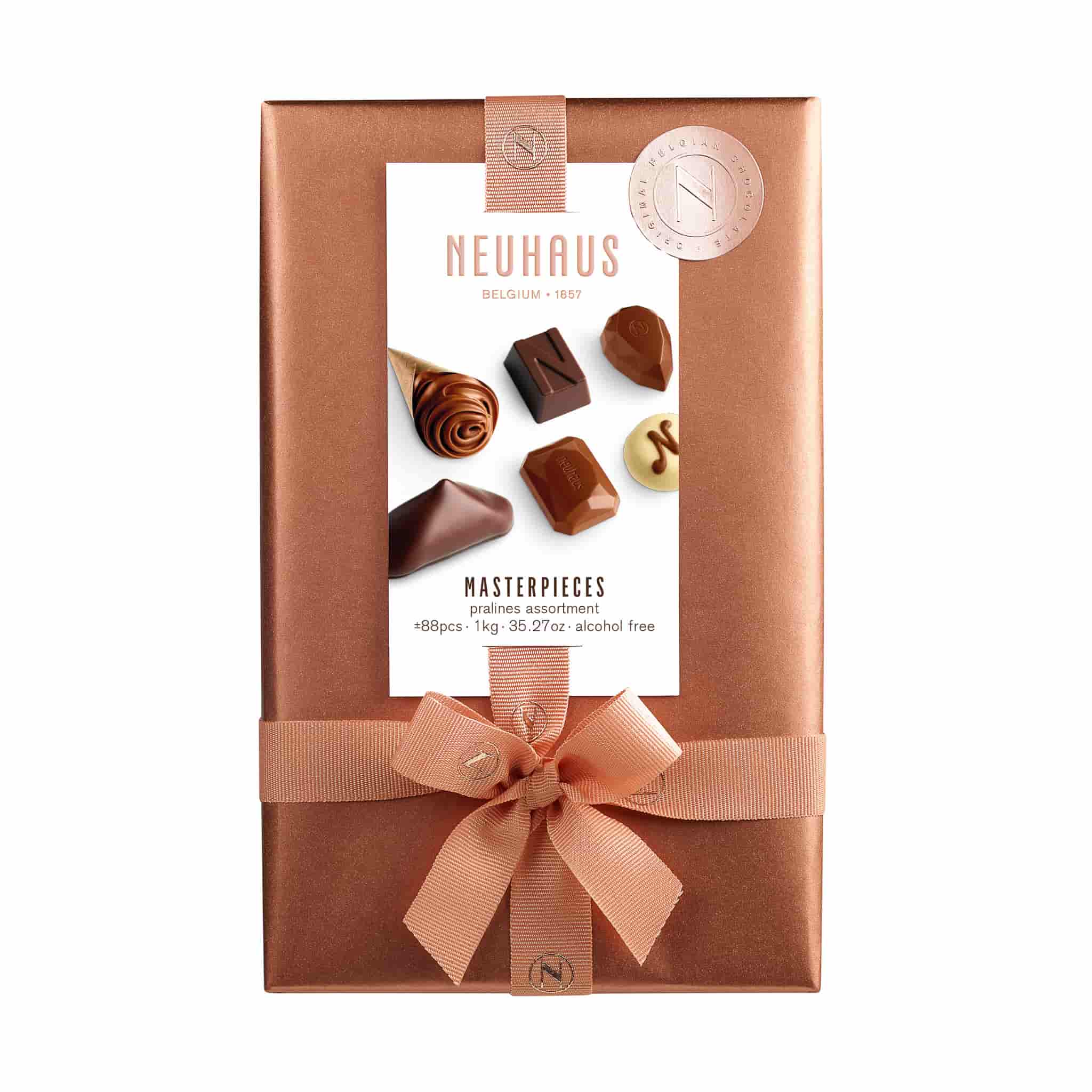 Neuhaus Timeless Masterpieces Ballotin (1kg) contains 88 hand-crafted chocolates. Open the beautiful bronze box to reveal cream, ganache and gianduja filled pralines. It’s tied with a bow, ready for gifting or to keep as a treat for yourself.