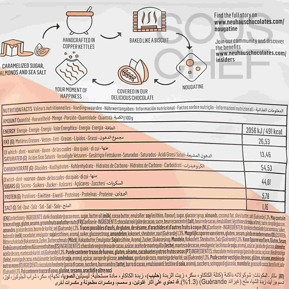 Product formulations and details may change. For the latest ingredients and allergen information always check product packaging prior to consumption. Ingredients: Dark chocolate (cocoa mass, sugar, butter oil (milk), cocoa butter, emulsifier: soy lecithins, flavour), sugar, glucose syrup, almonds, coconut fat, shea butter, salt (guérande).
