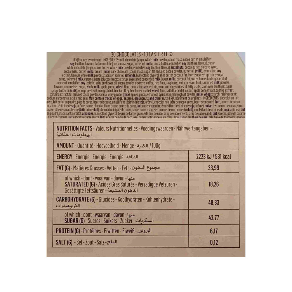 flavour), dark chocolate (cocoa mass, sugar, butter oil (milk), cocoa butter, emulsifier: soy lecithins, flavour), sugar, white chocolate (sugar, cocoa butter, whole milk powder, emulsifier: soy lecithin, flavour), hazelnuts, cocoa butter, glucose syrup, cocoa mass, butter (milk), cream (milk), dark chocolate (cocoa mass, sugar, fat reduced cocoa powder, butter oil (mik), emulsifier: soy lechithin, flavour), whole milk powder, stabiliser: sorbitol; almonds, humectant: glycerol; shea butter, coconut fat, invert sugar syrup, candy sugar syrup, skimmed milk, caramel paste (glucose fructose syrup, sweetened condensed milk (sugar, milk) , coconut fat, water, humectants: glycerol of rapeseed, emulsifier: soy lecithin, salt), sunflower oil, cocoa powder, dextrose, coffee, rice flour, raspberry, water, passion fruit, skimmed milk powder, flavours, caramelised sugar, whole milk, apple puree, wheat flour, emulsifier: soy lecithin,mono and diglycerides of fatty acids, sunflower lecithins; sugar syrup, butter oil (milk), orange peel, salt, mango black tea, earl grey tea, honey, malted wheat flour, salt (guerande), colour: apple concentrate, paprika extract, spirulina extract; fat reduced cocoa powder, vanilla, whey powder (milk), spices, glucose-fructose syrup, skimmed yoghurt powder (milk), wheat starch, raising agent: sodium carbonates; acid: citric acid.