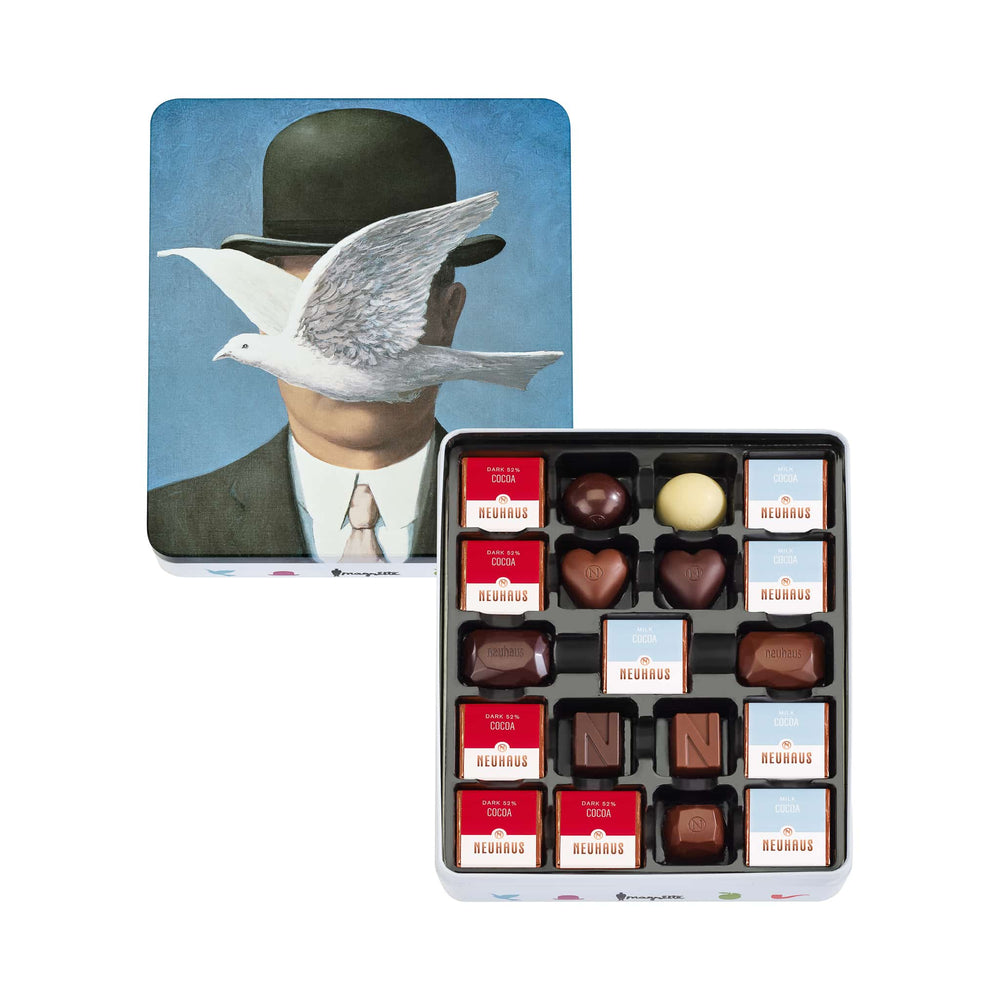The tin lid features Magritte’s painting, ‘L'Homme au Chapeau Melon’. It’s an ideal gift for art lovers and chocolate connoisseurs.