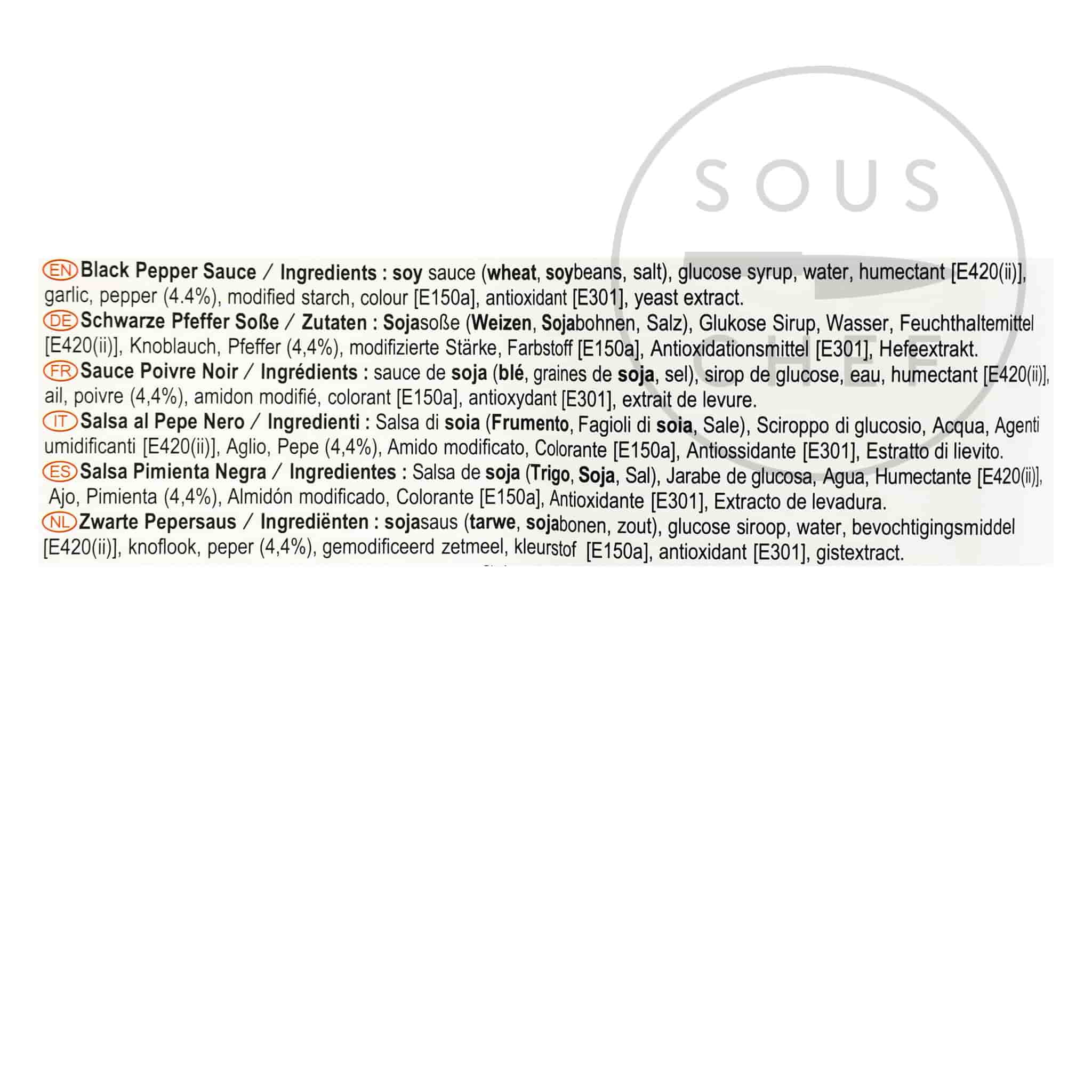 Product formulations and details may change. For the latest ingredients and allergen information always check product packaging prior to consumption. Ingredients: Soy sauce (wheat, soy beans, salt), glucose syrup, water, humectant [E420(ii)], garlic, pepper (4.4%), modified starch, colour [E150a], antioxidant [E301], yeast extract