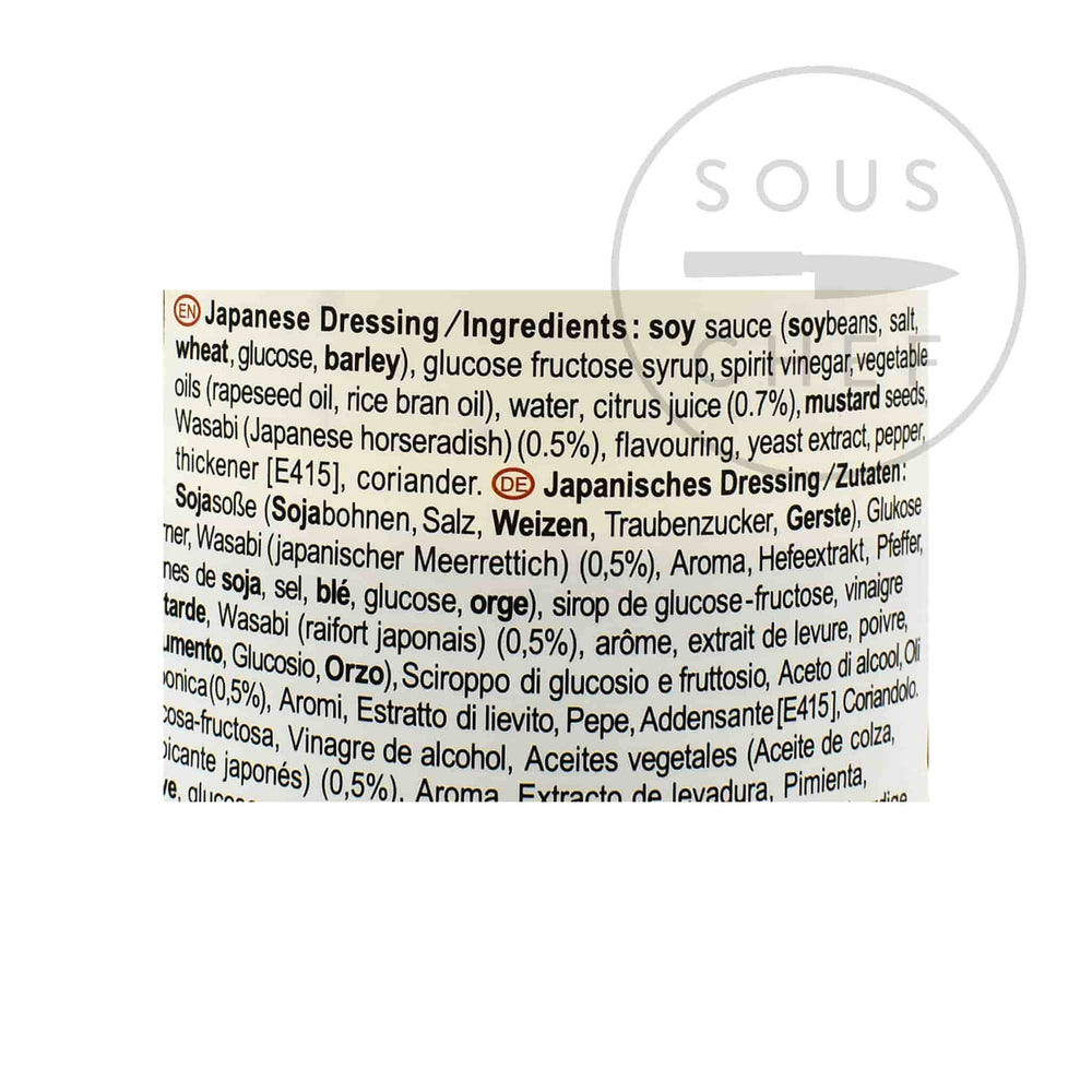 Product formulations and details may change. For the latest ingredients and allergen information always check product packaging prior to consumption. Ingredients: Soy sauce (soybeans, salt, wheat [gluten], glucose, barley [gluten], high fructose corn syrup, vinegar, rapeseed oil, water, citrus juice (0.7%), mustard, wasabi (japanese horseradish) (0.5%), flavouring, yeast extract, pepper, thickener: e415, coriander