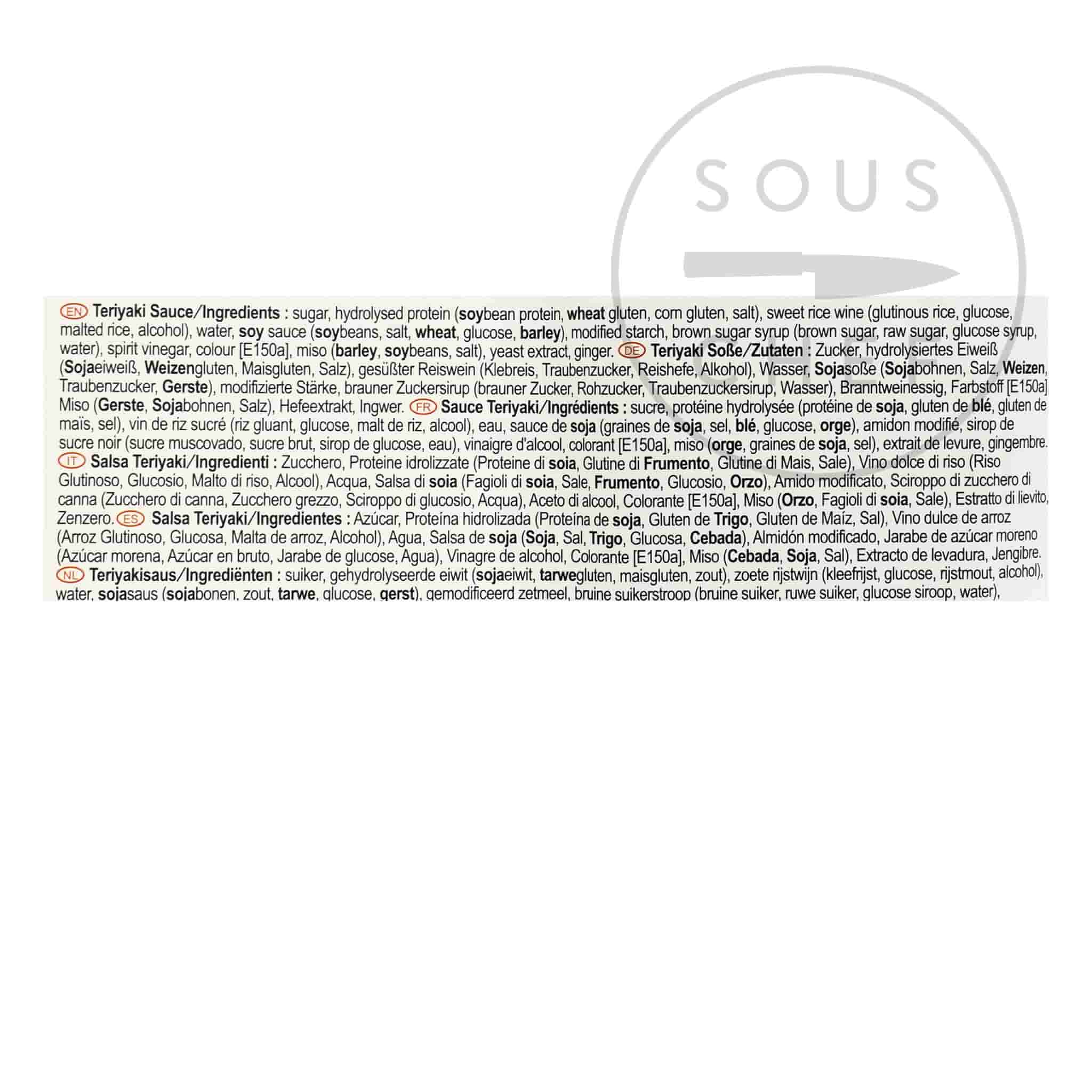 Product formulations and details may change. For the latest ingredients and allergen information always check product packaging prior to consumption. Ingredients: Sugar, hydrolysed protein (soybean protein, wheat gluten, corn gluten, salt), sweet rice wine (glutinous rice, glucose, malted rice, alcohol), water, soy sauce (soybeans, salt, wheat (gluten), glucose, barley (gluten)), thickener: modified starch, brown sugar syrup (brown sugar, raw sugar, glucose syrup, water), spirit vinegar, colour [E150a], miso (barley (gluten), soybeans, salt), yeast extract, ginger