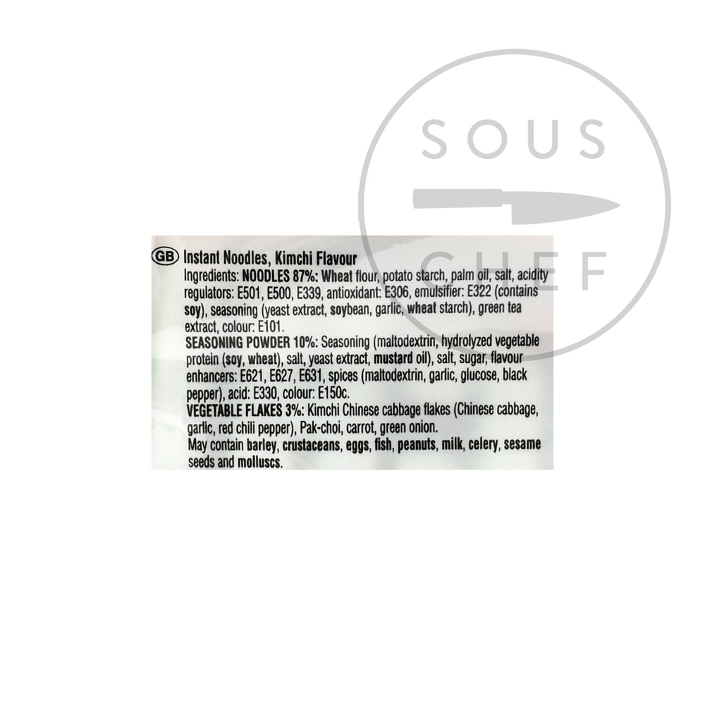 Product formulations and details may change. For the latest ingredients and allergen information always check product packaging prior to consumption. Ingredients: Noodles 87%: Wheat flour, potato starch, palm oil, salt, acidity regulator: E501, E500, E339, antioxidant E306, emulsifier: E322 (contains soy), seasoning (yeast extract, soybean, garlic, wheat starch), green tea extract, colour E101. Seasoning powder 10%: Seasoning (maltodextrin, hydrolyzed vegetable protein (soy, wheat), salt, yeast extract, mustard oil), salt, sugar, flavour enhancers: E621, E627, E631, spices (maltodextrin, garlic, glucose, black pepper), acid: E330, colour: E150c. Vegetable flakes 3%: kimchi Chinese cabbage flakes (Chinese cabbage, garlic, red chilli pepper), Pak-choi, carrot, green onion.