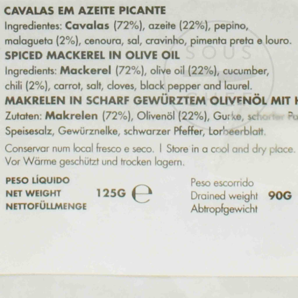 Product formulations and details may change. For the latest ingredients and allergen information always check product packaging prior to consumption. Ingredients: Mackerel (72%), olive oil (22%), cucumber, chilli (2%), carrot, salt, cloves, black pepper and laurel