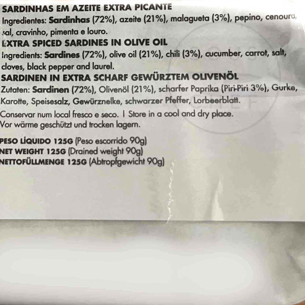Product formulations and details may change. For the latest ingredients and allergen information always check product packaging prior to consumption. Ingredients: Sardines (72%), olive oil (22%), cucumber, chilli (2%), carrot, salt, cloves, black pepper and laurel.