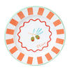 The plate has an orange striped rim and squiggly red border. In the centre is a green olive motif. Use it to serve homemade moussaka or penne alla vodka.