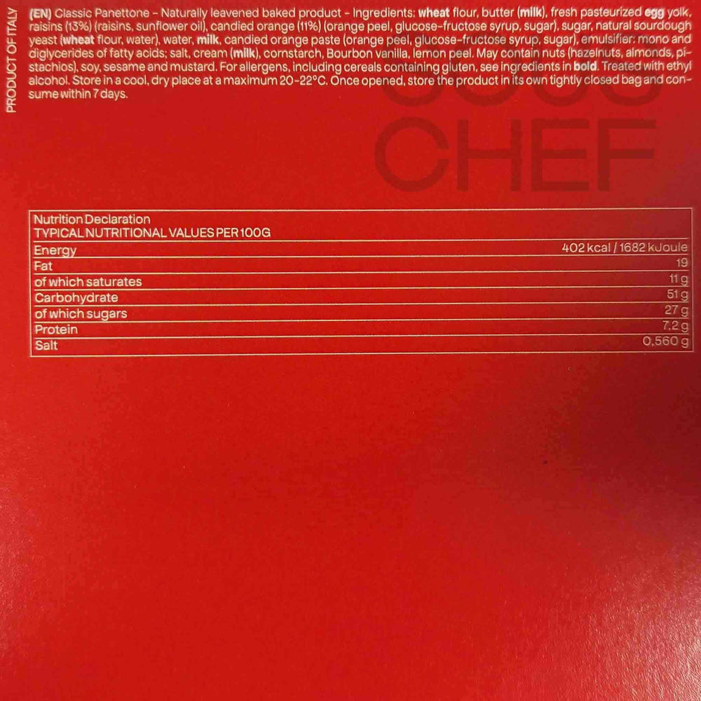 Product formulations and details may change. For the latest ingredients and allergen information always check product packaging prior to consumption. Ingredients: Wheat flour, butter, fresh pasteurized egg yolk, raisins (13%) (raisins, sunflower oil), candied orange (11%) (orange peel, glucose-fructose syrup, sugar), sugar, natural sourdough yeast (wheat flour, water), water, milk, candied orange paste (orange peel, glucose-fructose syrup, sugar), emulsifier: mono and diglycerides of fatty acids; salt, cream, cornstarch, bourbon vanilla, lemon peel. treated with ethyl alcohol.