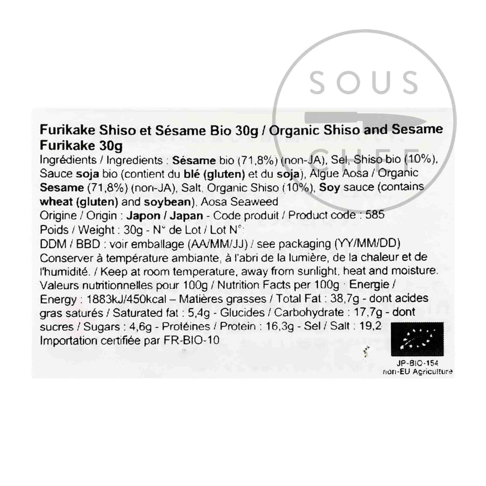 Organic shiso and sesame furikake is a salty, nutty mix for garnishing rice, fish and salads. Furikake is a dry Japanese condiment, traditionally made with dried fish and seaweed. This version blends seaweed with soy sauce, organic shiso and organic sesame seeds for a gentle crunch and iodine-rich flavour.
