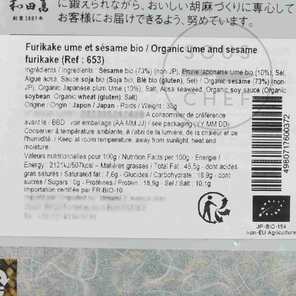 Product formulations and details may change. For the latest ingredients and allergen information always check product packaging prior to consumption. Ingredients: Organic sesame (73%), organic Japanese plum ume (10%), salt, aosa seaweed, organic soy sauce (organic soybean, organic wheat (gluten), salt).