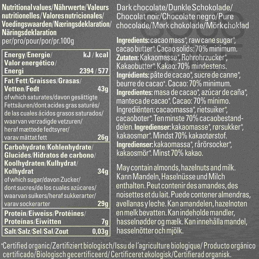 Product formulations and details may change. For the latest ingredients and allergen information always check product packaging prior to consumption. Ingredients: Cacao mass 62.13% * (congo dr), raw cane sugar 29.13% * (paraguay), cacao butter 8.74% * (dom. rep.). cacao solids 70% minimum.