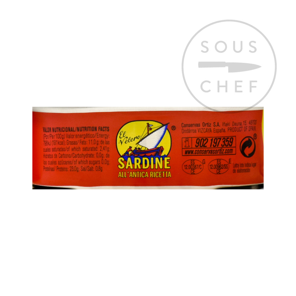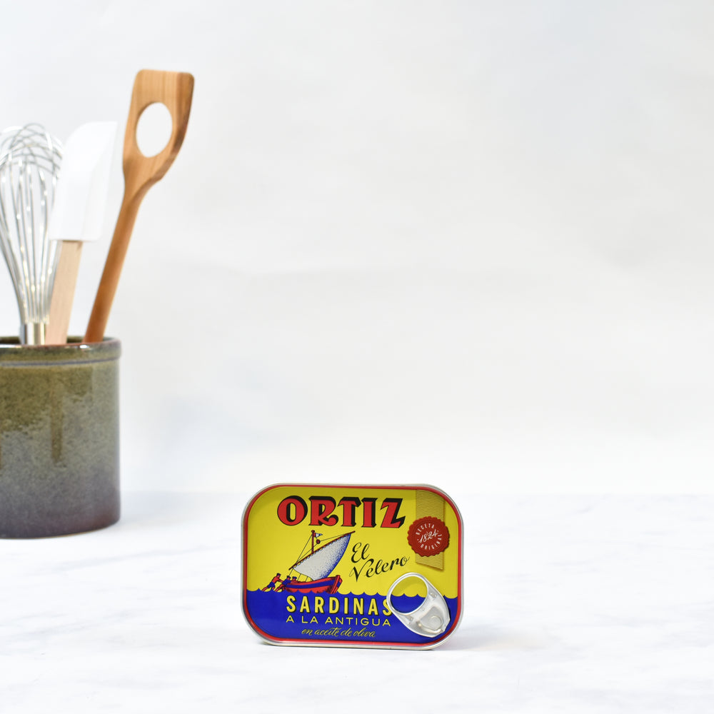 Enjoy sardines a la antigua in olive oil straight from the tin. Ortiz pick the freshest sardines from auctions on the north coast of Spain, then carefully clean and prepare them by hand. The sardines are quickly fried in virgin olive oil, before being tinned with olive oil and a little salt. Try lightly toasting slices of fresh, crusty bread, top with crushed tomatoes and garlic, and finally place a single sardine on top. Enjoy as a starter or snack.