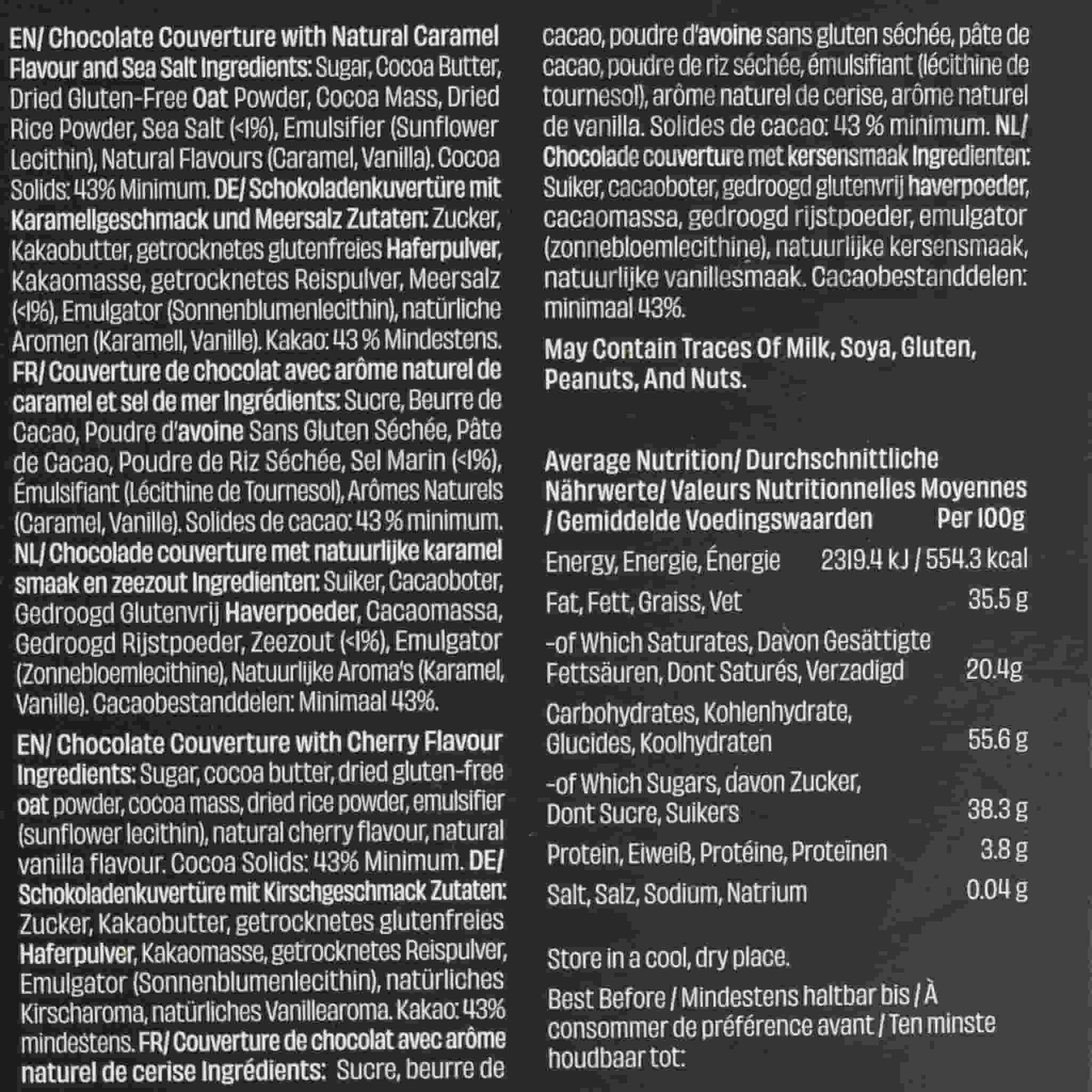 Product formulations and details may change. For the latest ingredients and allergen information always check product packaging prior to consumption. Ingredients: Otherly Salted Caramel Oatm*lk Chocolate: Sugar, cocoa butter, dried gluten-free oat powder, cocoa mass, dried rice powder, sea salt (<1%), emulsifier (sunflower lecithin), natural flavours (caramel, vanilla). Cocoa Solids: 43% Minimum. Otherly Cherry Oatm*lk Chocolate: Sugar (31%), cocoa butter (22%), dried gluten-free oat powder (22%), cocoa mass (21%), dried rice powder (3%), emulsifier (sunflower lecithin) (<1%), natural cherry flavour (<0.5%), natural vanilla flavour (<0.5%). Cocoa Solids: 43% Minimum.