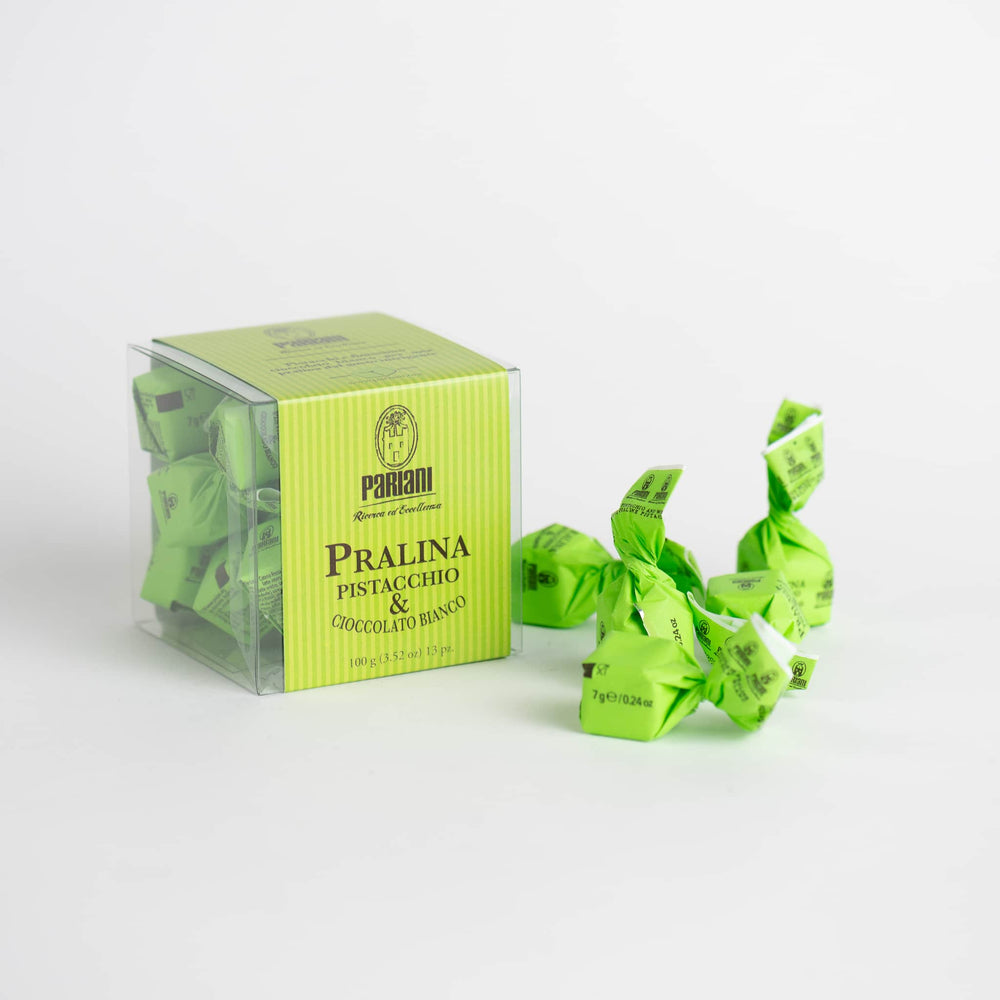Pariani pistachio and white chocolate pralines are delicate nutty delights of the finest Italian pistachios, both chopped and blended into a smooth paste, covered in white chocolate. The sweet, creamy treats are perfect with a morning coffee, or served with a liqueur after dinner.