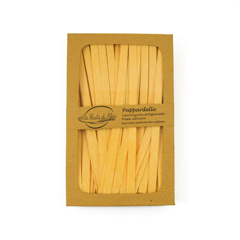 Pasta di Aldo pappardelle egg pasta has a rich and refined flavour - this is one pasta you won't want to smother with sauce! Serve the wide ribbons simply with a little butter or high quality olive oil and black pepper, to let the flavour of the pasta shine through.