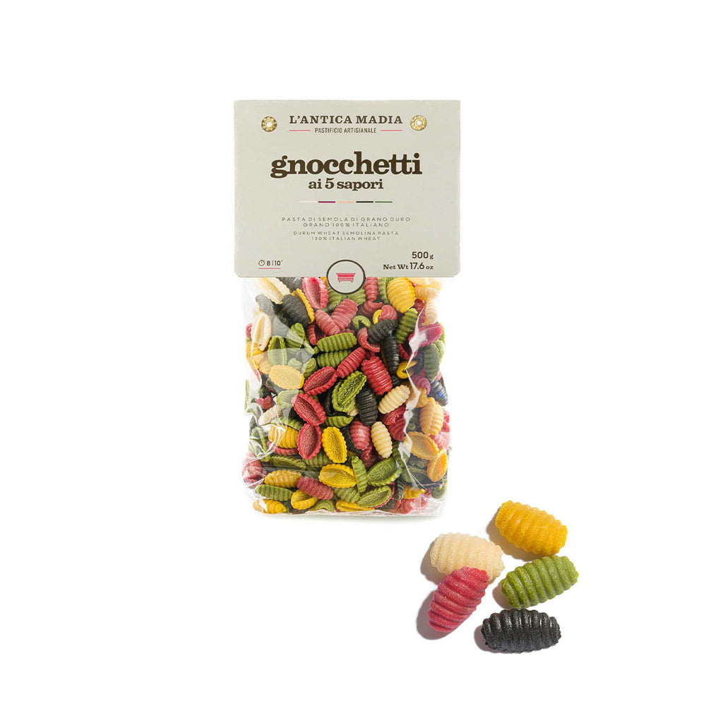 Use Pasta L’Antica multicoloured gnocchetti to make colourful pasta dishes for family and friends. The rainbow colours are created by adding natural ingredients like squid ink, beetroot and tomato to the pasta dough.