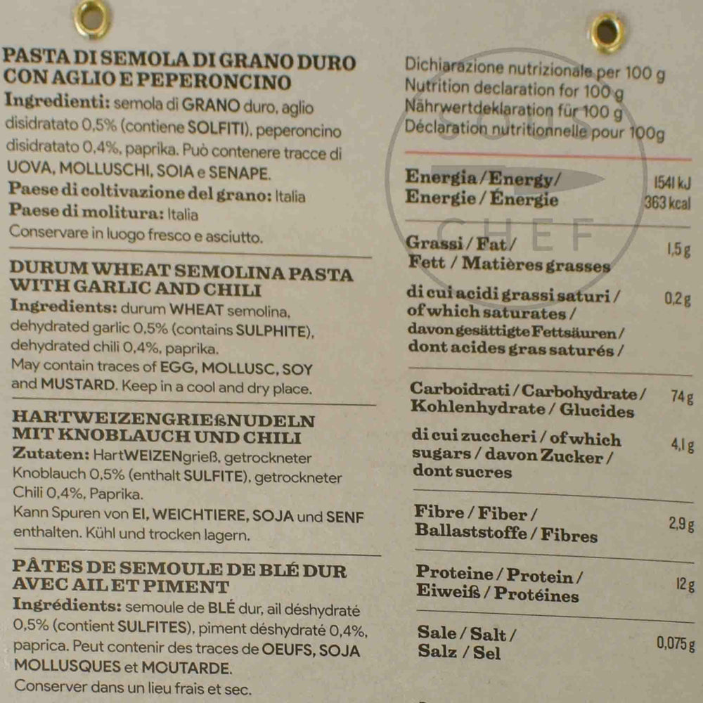 Product formulations and details may change. For the latest ingredients and allergen information always check product packaging prior to consumption. Ingredients: durum WHEAT semolina, dehydrated garlic 0,5% (contains SULPHITE), dehydrated chili 0,4%, paprika.