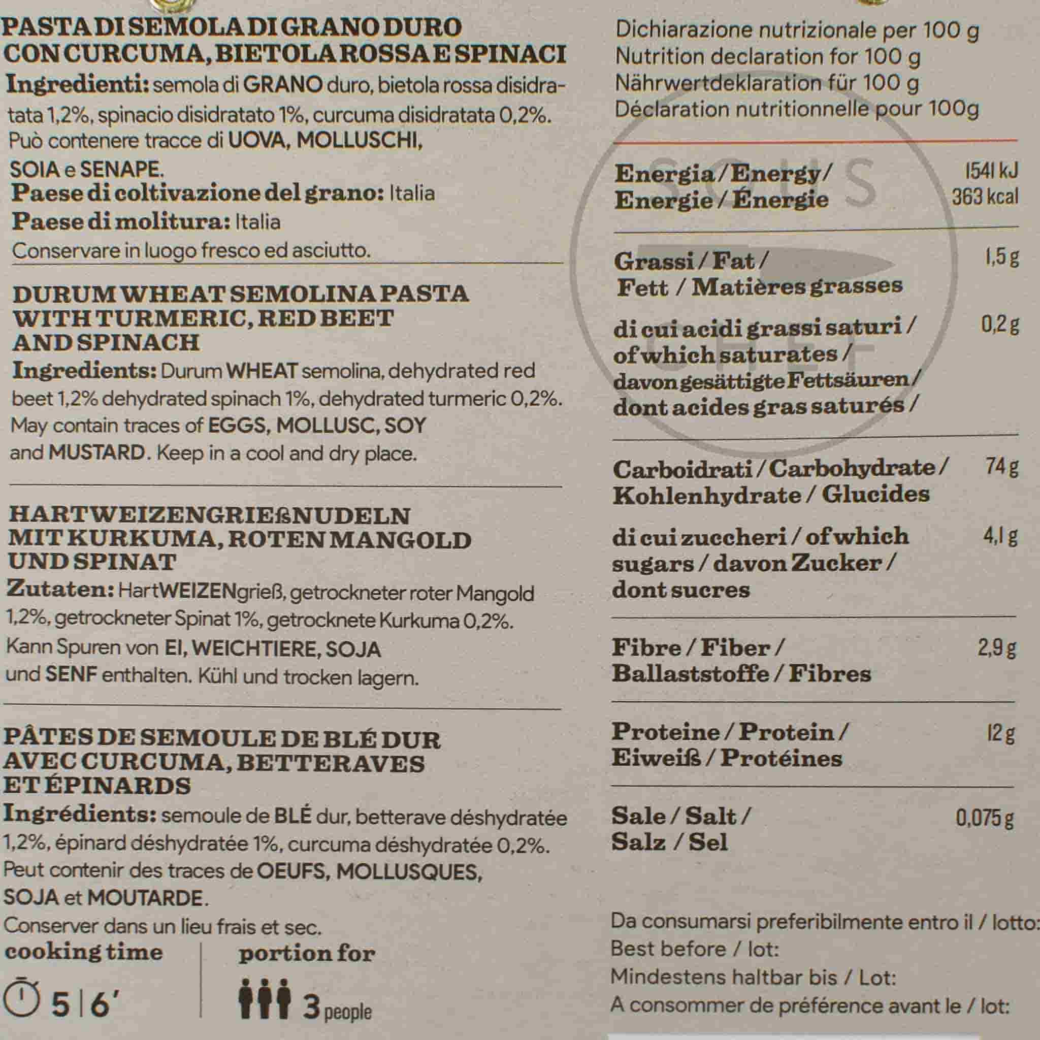 Product formulations and details may change. For the latest ingredients and allergen information always check product packaging prior to consumption. Ingredients: durum WHEAT semolina, dehydrated red beet 1,2%, dehydrated spinach 1%, dehydrated turmeric 0,2%