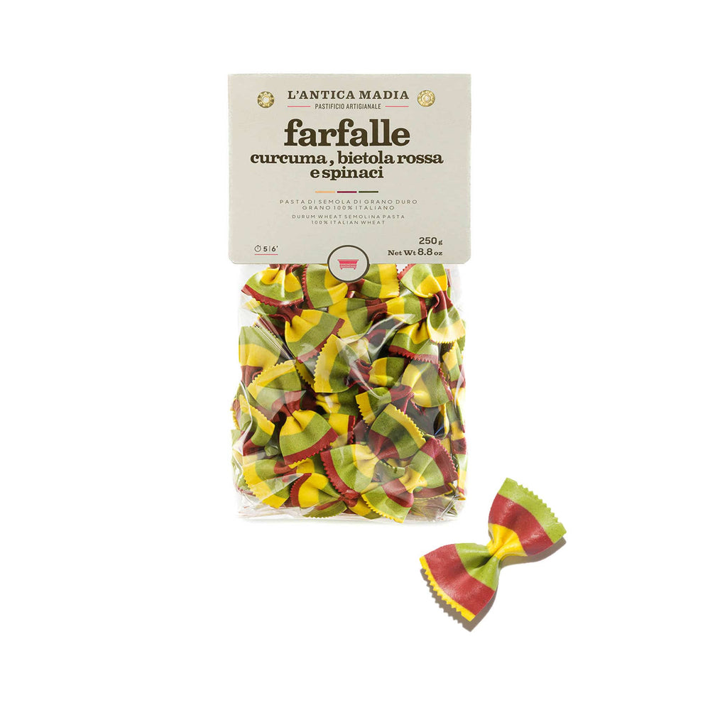 Pasta L’Antica striped farfalle gets its bold colours from natural, organic ingredients. Beetroot, spinach and earthy turmeric are added to the dough to create stripes of red, green and gold. Served in plain white bowls, the colourful bow-tie pasta is sure to turn heads at your next dinner party. Toss the cooked pasta with sautéed garlic, chilli and tomatoes for a simple but delicious meal.