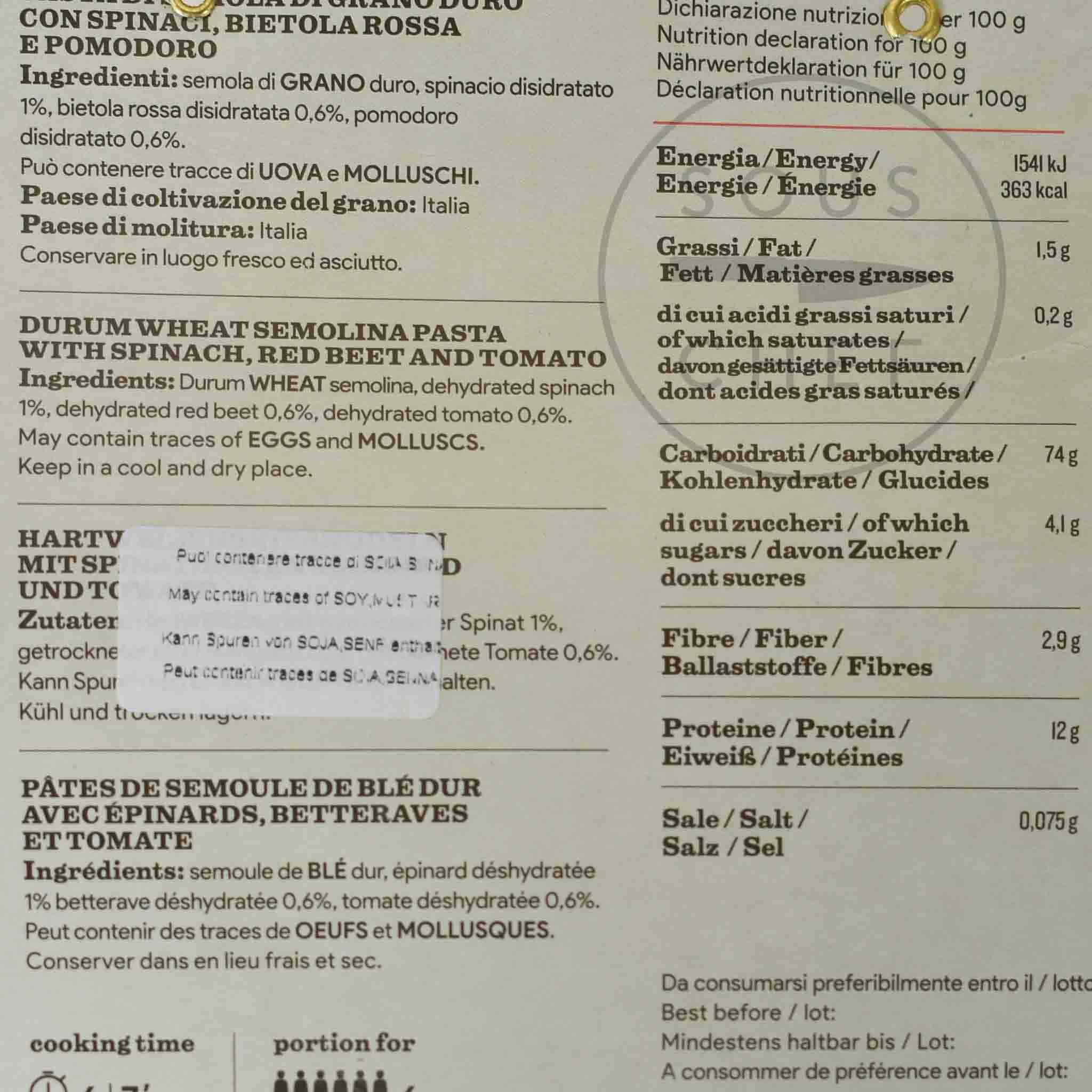 Product formulations and details may change. For the latest ingredients and allergen information always check product packaging prior to consumption. Ingredients: durum WHEAT semolina, , dehydrated spinach 1%, dehydrated red beet 0,6% dehydrated tomato 0,6%