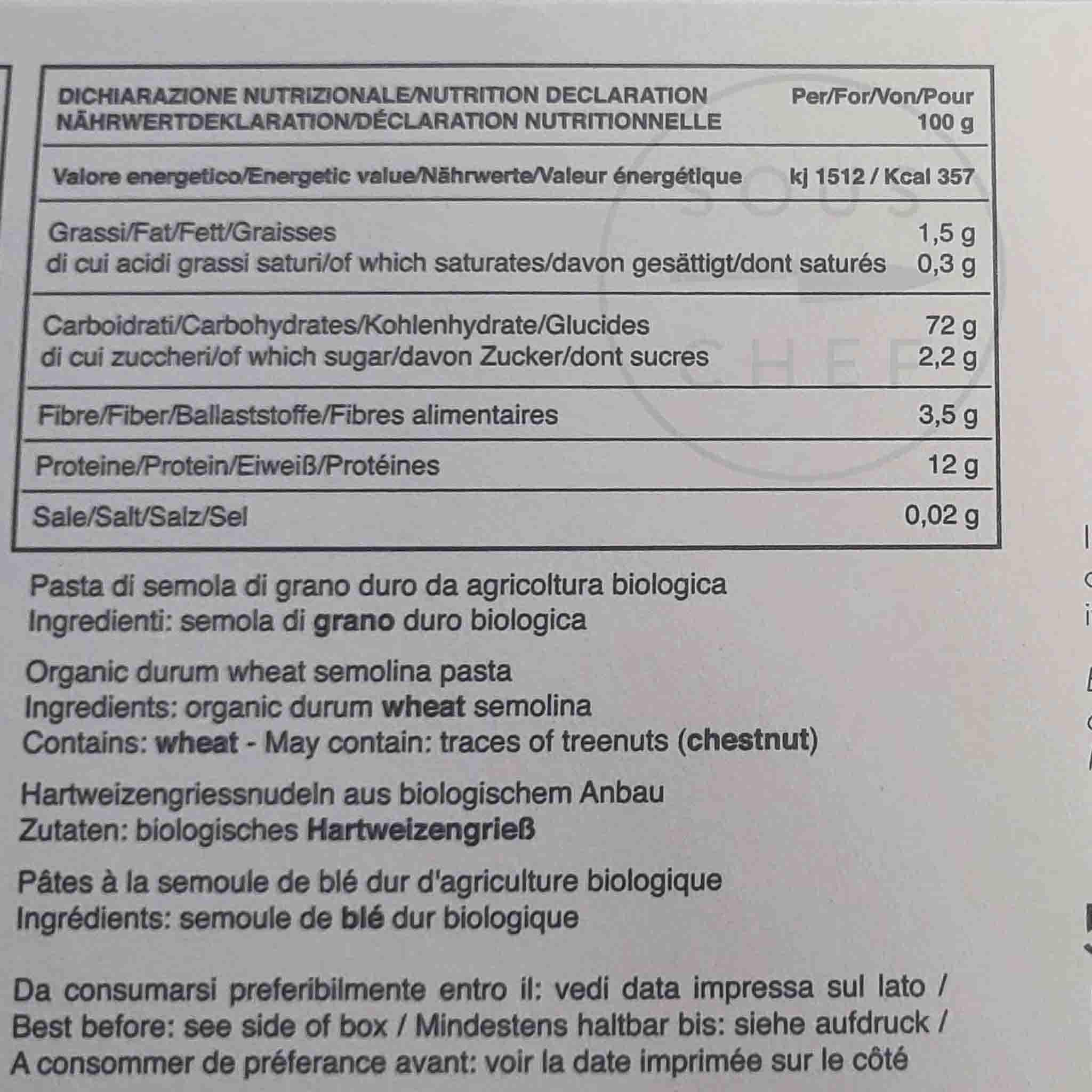 Product formulations and details may change. For the latest ingredients and allergen information always check product packaging prior to consumption. Ingredients: Organic durum wheat semolina 100%