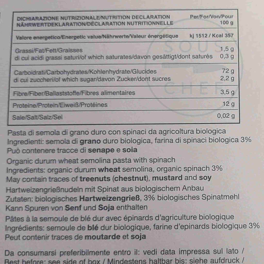 Product formulations and details may change. For the latest ingredients and allergen information always check product packaging prior to consumption. Ingredients: Organic durum wheat semolina 97% and organic spinach flour 3 %