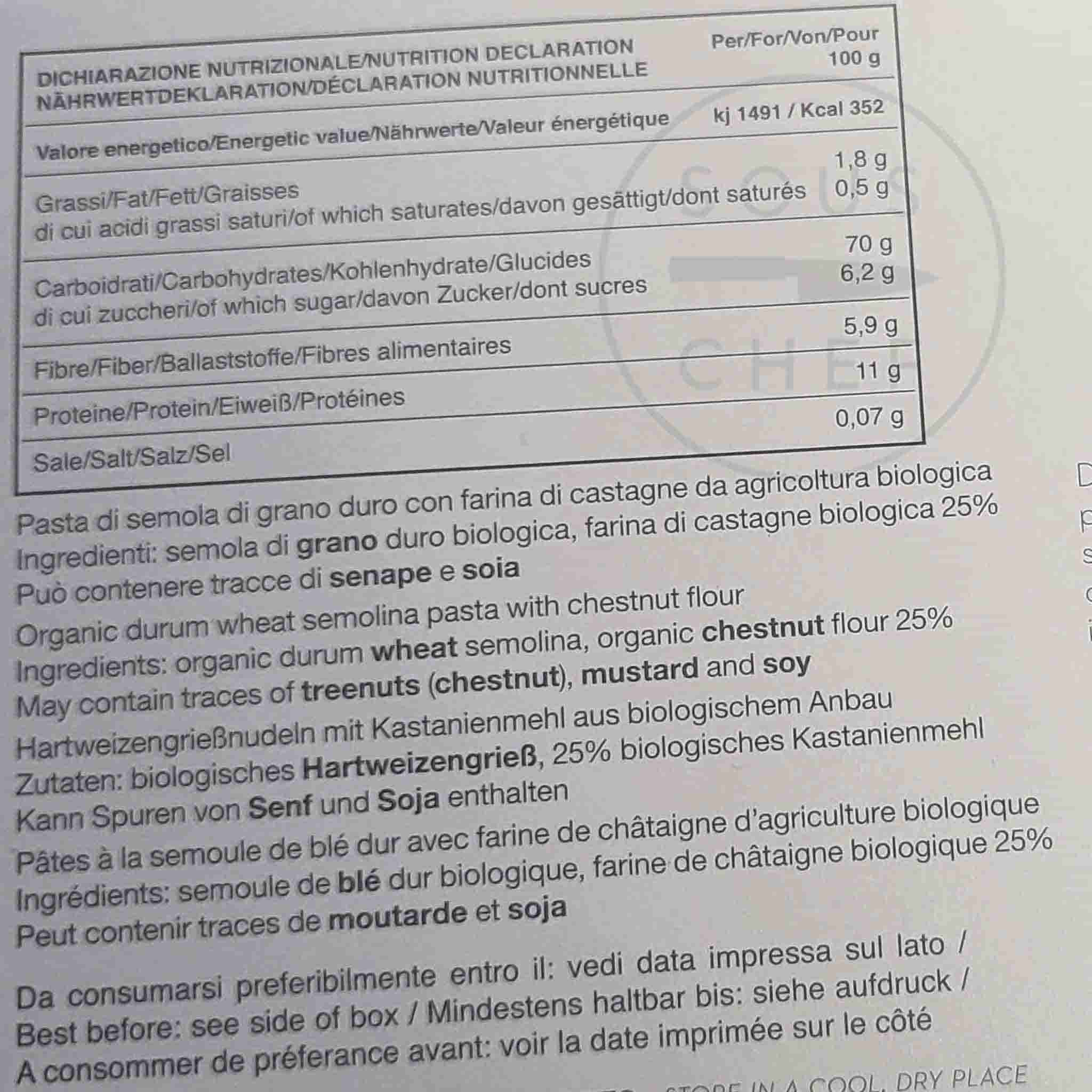 Product formulations and details may change. For the latest ingredients and allergen information always check product packaging prior to consumption. Ingredients: Organic durum wheat semolina 75% and organic chestnut flour 25%