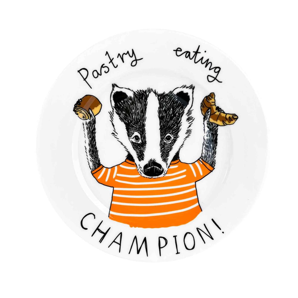 The side plate features our champion badger, with pastries in each hand, proudly celebrating the achievement. Each design is hand applied.